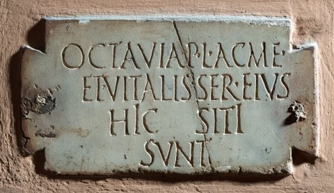 - Octavia P(ubli) l(iberta) Acme / et Vitalis ser(vus) eius / hic siti / sunt