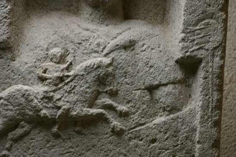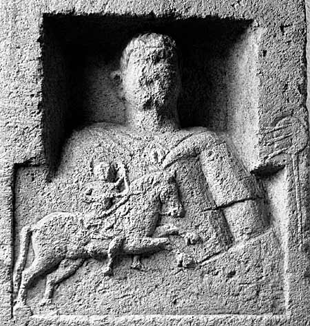 - In Rechtecknische Brustbild eines Mannes: bartlos, kurzgesträhntes Haar. Über der Brust galoppierender Reiter mit Bogen, rechts auf dem Rahmen Zielscheibe mit drei Pfeilen.