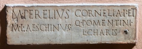 - M(arcus) Perelius / M(arci) l(ibertus) Aeschinus // Cornelia P(ubli) et / Q(uinti) Pomentini / l(iberta) Charis