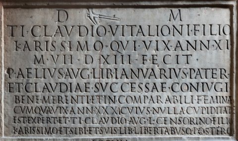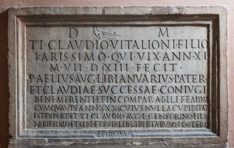 - D(is) M(anibus) / Ti(berio) Claudio Vitalioni filio / karissimo qui vix(it) ann(os) XI / m(enses) VII d(ies) XIII fecit / P(ublius) Aelius Aug(usti) lib(ertus) Ianuarius pater / et Claudiae Successae coniugi / bene merenti et incomparabili feminae / cum qua vix(it) ann(os) XXXI cuius nulla(m) cupiditate(m) / est expert(us) et Ti(berio) Claudio Aug(usti) l(iberto) Censorino filio / karissimo et sibi et suis lib(ertis) libertabusq(ue) poster(is)q(ue) / eorum