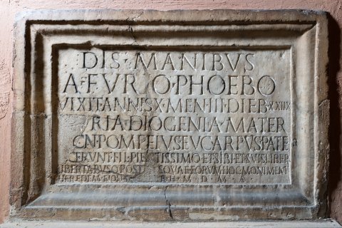 - Dis Manibus / A(ulo) Furio Phoebo / vixit annis X men(sibus) III dieb(us) XXIIX / Furia Diogenia mater / et Cn(aeus) Pompeius Eucarpus pater / fecerunt fil(io) pientissimo et sibi et suis liber(tis) / libertabusq(ue) posterisqu{a}e eorum hoc mon<u=I>ment(um) / heredem non sequetur h(uic) m(onumento) d(olus) m(alus) a(besto)