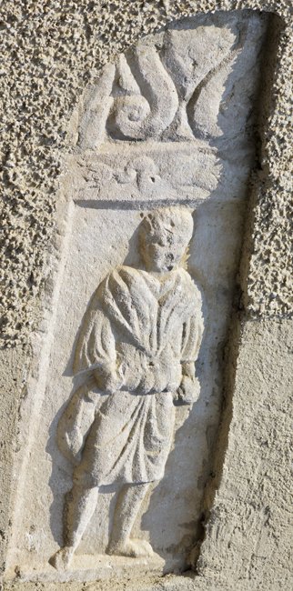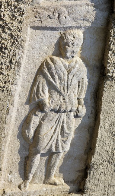 - In rechteckigem Bildfeld stehender Mann (Soldat ?), bärtig (?), in kurzer Tunica mit Gürtel und Paenula, in der Rechten Dolch (?), in der Linken ?. Auf der oberen Rahmenleiste Delphin, darüber stehende gegenständige S-Haken mit Spiralrenden.