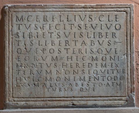 - M(arcus) Cerellius Cle/tus fecit se vivo / sibi et suis liber/tis libertabus/que posterisque / eorum hic moni/mentus(!) heredem ex/terum non sequitur / huic mon<u=I>mento do/lus malus abesto afu/turusque