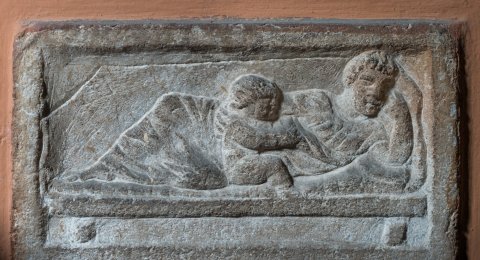 - Über der Inschrift rechteckiges Bildfeld mit liegendem Mann und vor ihm sitzenden Kind (Knabe) auf einer Kline.
