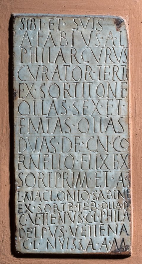 - Sibi et suis / A(ulus) Fabius A(uli) l(ibertus) / Philargurus / curator terti(um) / ex sortit(i)one / ollas sex et / em(p)tas ollas / duas de Cn(aeo) C[o]/rnelio F(e)lix(!) ex / sort(e) prim(a) et a S() / L(ucio) Maclonio Sabine / ex sorte ter(tia) olla(m) d(edit) / C(aius) Vet(t)ienus C(ai) l(ibertus) Phila/delp(h)us Vet(t)iena / C(ai) l(iberta) Ny{i}ssa a(mico) m(erenti)