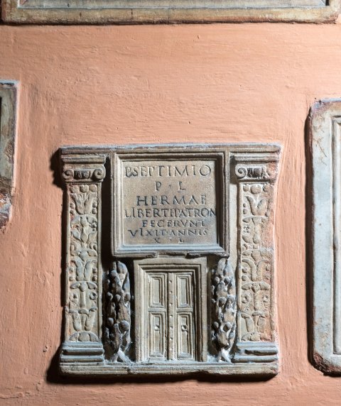 - Eckpilaster mit Akanthus- und Lotuskelchen, jonische Kapitelle; dazwischen oben gerahmte Schrifttafel, darunter Türrelief zwischen Lorbeerbüschen.