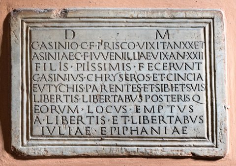 - D(is) M(anibus) / C(aio) Asinio C(ai) f(ilio) Prisco vixit an(nos) XX et / Asiniae C(ai) f(iliae) Iuvenillae vix(it) an(nos) XXII / fili(i)s piissimis fecerunt / C(aius) Asinius Chryseros et Cincia / Eutychis parentes et sibi et suis / libertis libertabus posterisq(ue) / eorum locus emptus / a libertis et libertabus / Iuliae Epiphaniae