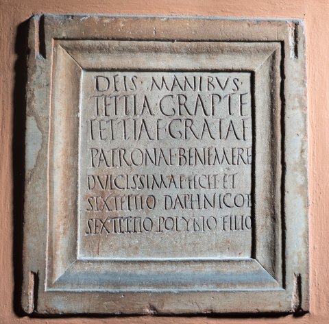 - Deis(!) Manibus / Tettia Grapte / Tettiae Gratae / patronae bene mere(nti) / dulcissimae fecit et / Sex(to) Tettio Daphnico et / Sex(to) Tettio Polybio filio
