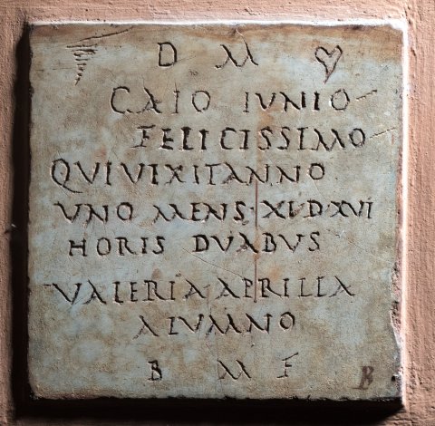 - D(is) M(anibus) / Gaio Iunio / Felicissimo / qui vixit anno / uno mens(ibus) XI d(iebus) XVI / horis duabus / Valeria Aprilla / alumno / b(ene) m(erenti) f(ecit)