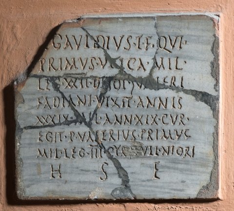 - T(itus) Gavidius T(iti) f(ilius) Qui(rina) / Primus Utica mil(es) / leg(ionis) XXI Deiot(arianae) |(centuria) Valeri / Fadiani vixit annis / XXXIX mil(itavit) ann(is) XIX cur(am) / egit P(ublius) Valerius Primus / mil(es) leg(ionis) III Cyr(enaicae) |(centuria) Tulli Nigri / h(ic) s(itus) e(st)