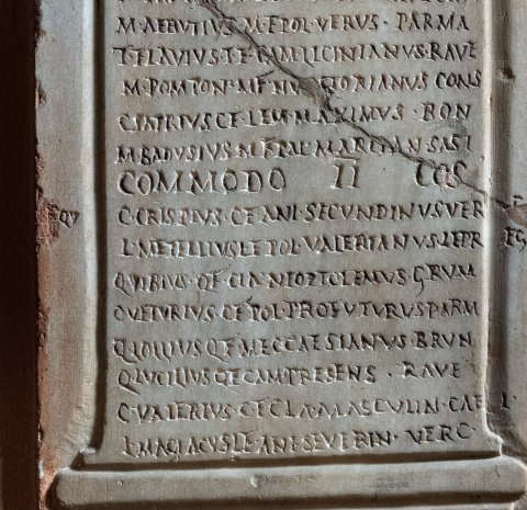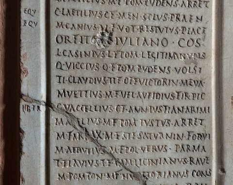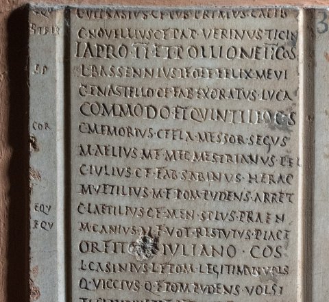 - --- ]/ equ(es) C(aius) Vitrasius C(ai) f(ilius) Pub(lilia) Primus Calib(us) / b(eneficiarius) trib(uni) C(aius) Novellius C(ai) f(ilius) Pap(iria) Verinus Ticin(o) / L(ucio) Apro II et Pollione II co(n)s(ulibus) / sp(eculator) L(ucius) Bassennius L(uci) f(ilius) O(u)f{f}(entina) Felix Mev(an)i(a) / C(aius) Enastellio C(ai) f(ilius) Fab(ia) Exoratus Luca / Commodo et Quintillo co(n)s(ulibus) / cor(nicularius?) C(aius) Memorius C(ai) f(ilius) Fla(via) Messor Segus(ione) / M(arcus) Aelius M(arci) f(ilius) M(a)ec(ia) Mestrianus Pel(agonia) / C(aius) Iulius C(ai) f(ilius) Fab(ia) Sabinus Herac(leia) / M(arcus) Vetilius M(arci) f(ilius) Pom(ptina) Pudens Arret(io) / equ(es) C(aius) Laetilius C(ai) f(ilius) Men(enia) Splus Praen(este) / equ(es) M(arcus) Canius M(arci) f(ilius) Vot(uria) Restutus Place(ntia) / Orfito et Iuliano co(n)s(ulibus) / L(ucius) Casinius L(uci) f(ilius) Pom(ptina) Legitimus Vols(iniis) / Q(uintus) Viccius Q(uinti) f(ilius) Pom(ptina) Pudens Volsi(niis) / Ti(berius) Claudius Ti(beri) f(ilius) O(u)f{f}(entina) Victorin(us) Meva(nia) / M(arcus) Vettius M(arci) f(ilius) Vel(ina) Aufidius Fir(mo) Pic(eno) / lib(rarius) tr(ibuni) C(aius) Vaccellius C(ai) f(ilius) An(ie)n(si) Iustian(us) Arimi(no) / M(arcus) Aelius M(arci) f(ilius) Pom(ptina) Iustus Arret(io) / M(arcus) Farrax M(arci) f(ilius) Ste(llatina) Saturnin(us) For(o) Vi(bi) / M(arcus) Aebutius M(arci) f(ilius) Pol(lia) Verus Parma / T(itus) Flavius T(iti) f(ilius) Cam(ilia) Licinianus Rave(nna) / M(arcus) Pompon(ius) M(arci) f(ilius) Nuc() Storianus Cons(entia?) / C(aius) Satrius C(ai) f(ilius) Lem(onia) Maximus Bon(onia) / M(arcus) Badusius M(arci) f(ilius) Pal(atina) Marcian(us) Sas(s)i(na?) / Commodo II co(n)s(ule) / equ(es) C(aius) Crispius C(ai) f(ilius) Ani(ensi) Secundinus Ver(cellis) / L(ucius) Metellius L(uci) f(ilius) Pol(lia) Valerianus Lep(ido) Reg(io) / Q(uintus) Vibius Q(uinti) f(ilius) Cla(udia) Neoptolemus Grum(ento) / C(aius) Veturius C(ai) f(ilius) Pol(lia) Profuturus Parm(a) / Q(uintus) Lollius Q(uinti) f(ilius) M(a)ec(ia) Caesianus Brun(disio) / Q(uintus) Lucilius Q(uinti) f(ilius) Cam(ilia) Pr(a)esens Rave(nna) / C(aius) Valerius C(ai) f(ilius) Cla(udia) Masculin(us) Cael(ia) / L(ucius) Magiacus L(uci) f(ilius) Ani(ensi) Severin(us) Verc(ellis) / [---
