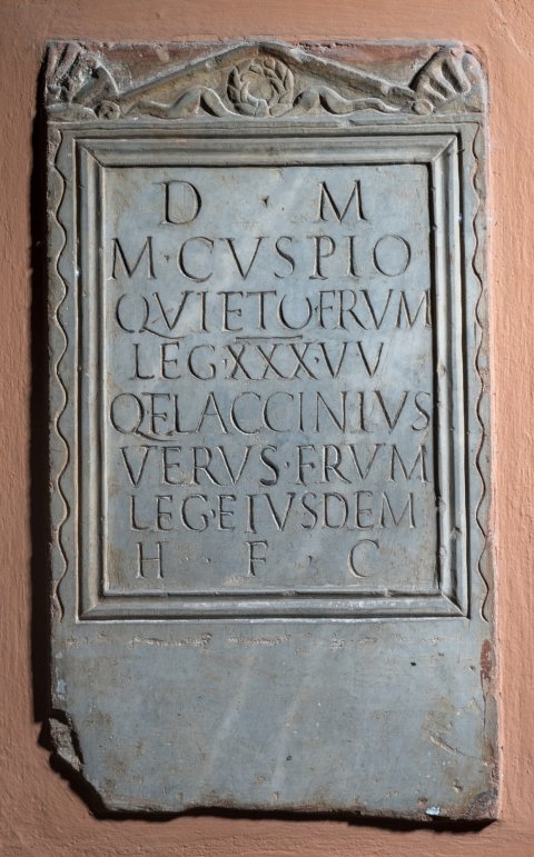 - D(is) M(anibus) / M(arco) Cuspio / Quieto frum(entario) / leg(ionis) XXX U(lpiae) V(ictricis) / Q(uintus) Flaccinius / Verus frum(entarius) / leg(ionis) eiusdem / h(eres) f(aciendum) c(uravit)