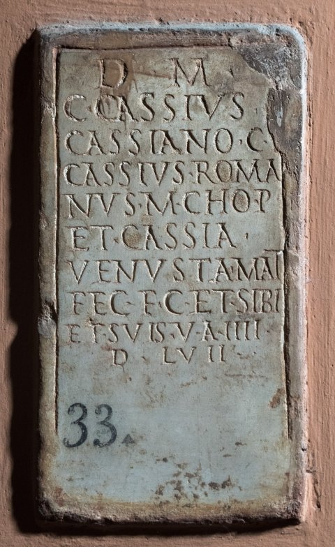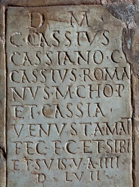 - D(is) M(anibus) / C(aio) Cassius(!) / Cassiano C(aius) / Cassius Roma/nus m(iles) c(o)ho(rtis) p(raetoriae) / et Cassia / Venusta mat(er) / fec(erunt) f(ilio) c(arissimo) et sibi / et suis v(ixit) a(nnos) IIII / d(ies) LVII