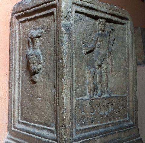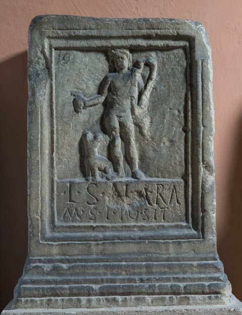 Auf der Vorderseite mythische Figur: stehender jugendlicher Silvanus, in linken Arm Pedum, in der Rechten Winzermesser, neben dem rechten Bein sitzender Hund. Unterhalb vorspringende Leiste mit Inschrift.