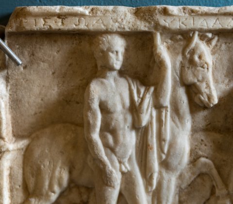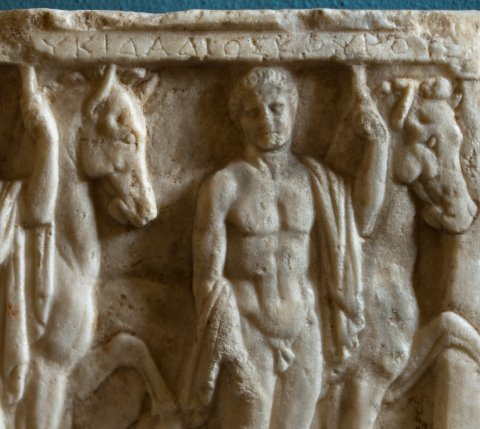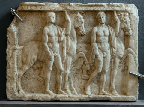 - Mythische Figuren: Dioskuren, vor ihren Pferden stehend. Auf der oberen Rahmenleiste Inschrift.
