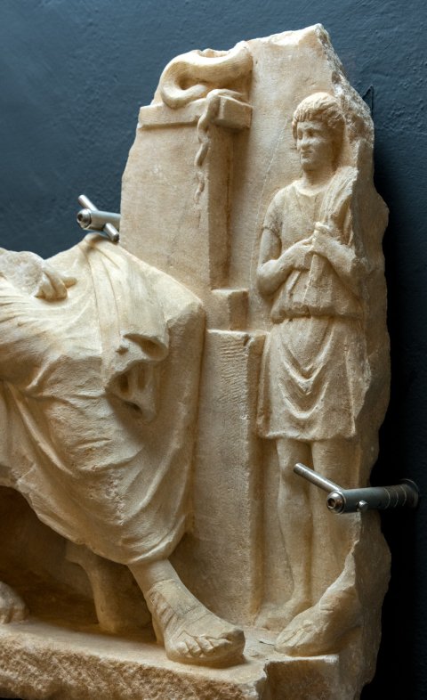 - Mythische Figur: links auf einem Sitz mit Löwenbeinen Asklepios in Mantel und Sandalen.Im Hintergrund auf einem Pfeiler stehender Altar, darauf Schlange, neben dem Pfeiler stehender Diener in kurzem Chiton, unten rechts noch der rechte Fuß einer Asklepios gegenüber sitzenden Person (Hygieia ?).