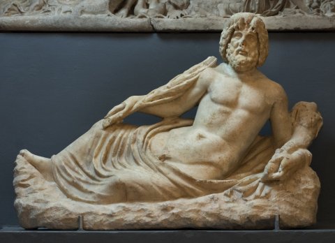 - Mythische Figur: gelagerter Flussgott, Mantel um die Bein, im linken Arm Füllhorn, im rechten Schilfstängel. Bärtiger Kopf vermutlich von einer Asklepios-Statue.
