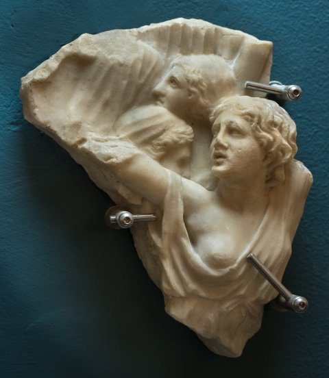 - Mythos ? Entführungsszene ? Im Vordergrund Oberteil einer jungen Frau mit offenem kurzen Haar, im gegürteten Chiton, der die rechte Brust entblößt, beide Arm ausgestreckt, Kopf zu rechten Schulter gedreht. Im Hintergrund zwei weitere Frauenköpfe im Profil.