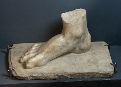- Plinthe mit vorn abgerundetem Rand, darauf rechter nackter Fuß einer überlebensgroßen männlichen Statue