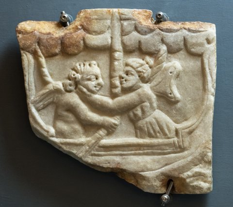 - Mythische Figuren: Eros und Psyche in einem Boot mit gerefftem Segel