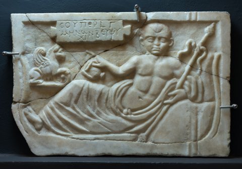 Totnmahl: auf einer Kline gelagerter Knabe (mit Horuslocke ?), Mantel um Beine und linken Arm, in der Rechten Kantharos, der Zeigefinger weist auf eine Greifenfigur mit Rad hin, die auf einer Standleiste steht; im linken Arm Thyrsosstab.