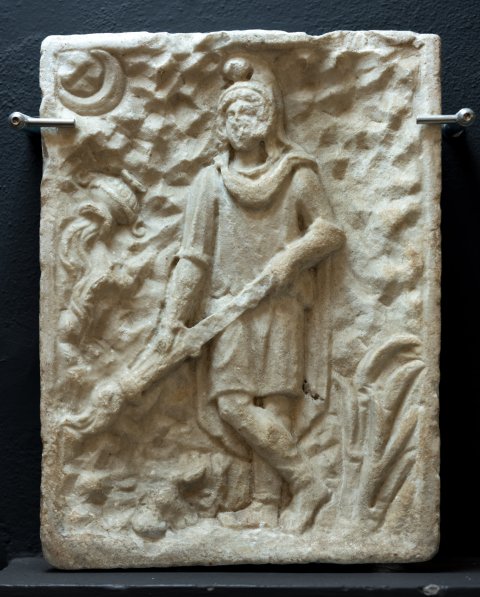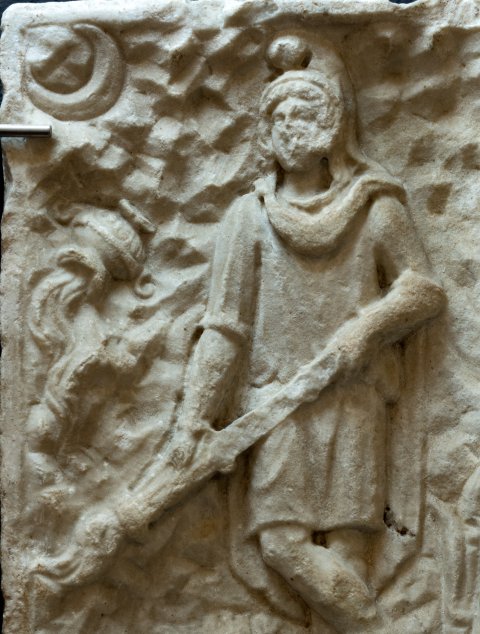 - Mythische Figur: Cautopates mit phrygischer Mütze und Hosen, gesenkte Fackel in den Händen, Hintergrund felsig, oben im linken Eck Mondsichel und Stern, unterhalb davon umgestürztes Gefäß (Krater ?), aus dem Wasser fließt; unten rechts Pflanze.
