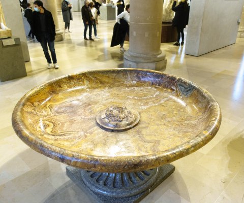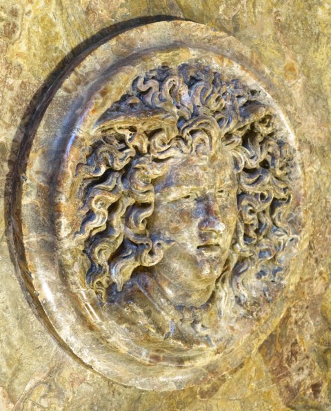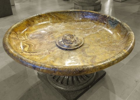 - Faches Becken auf kanneliertem Fuß aus Granit (?). Abgerundeter Rand, in der Mitte gewölbtes Medaillon mit Gorgoneion.