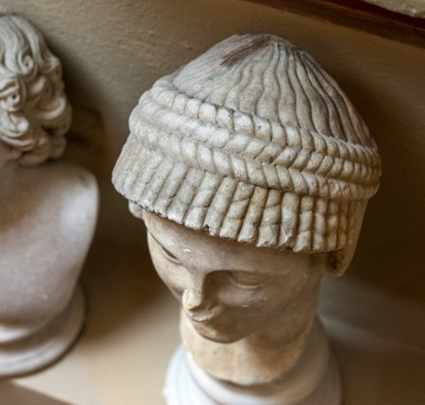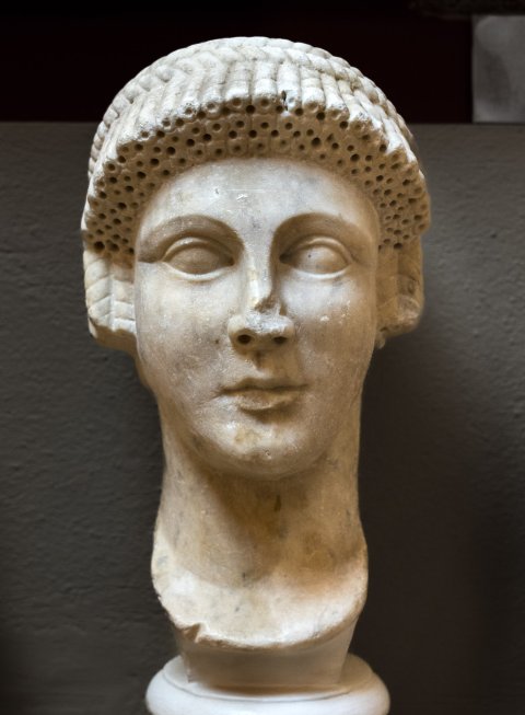 - Kopf einer Frau mit archaistischer Frisur(Reiehen von Spirallocken um die Stirn, Zopf um den Oberkopf. Kopf zum Einsetzen (Herme ?).