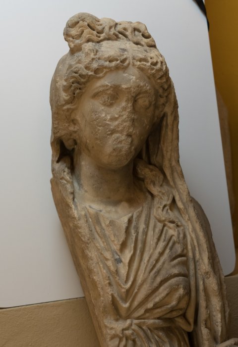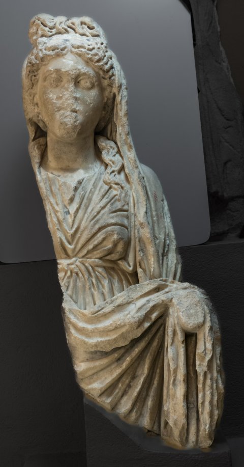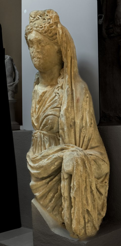 - Stehende Frau mit Haarschleife und Schulterlocken, in hoch gegürteter Tunica und über den Hinterkopf gezogenem Mantel. Göttin ?