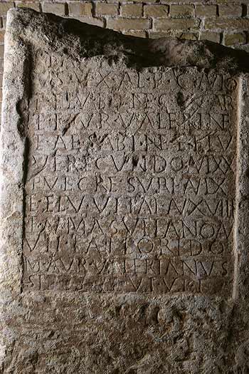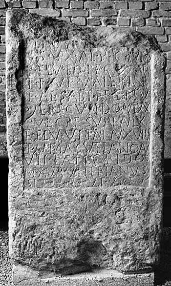- M(arcus) Aur(elius) [Valerian]/us vex(illarius) al(ae) p(rimae) c(ontariorum) Anto(ninianae) / et Elv(iae) Bon(a)e c(oniugi) car(issimae) / et f(iliae) Aur(eliae) Valerin(a)e / et Ae(liae) Sabin(a)e et Elv(io) / Verecundo an(norum) LXX / Pulc(h)r(a)e Suri (servae) an(norum) LX / et Elv(io) Vitali an(norum) XVIII / et Au(relio) Ma(n)suetiano an(norum) / VII et Ae(lio) Florido / M(arcus) Aur(elius) Valerianus / sib(i) et suis vivi f(ecit)