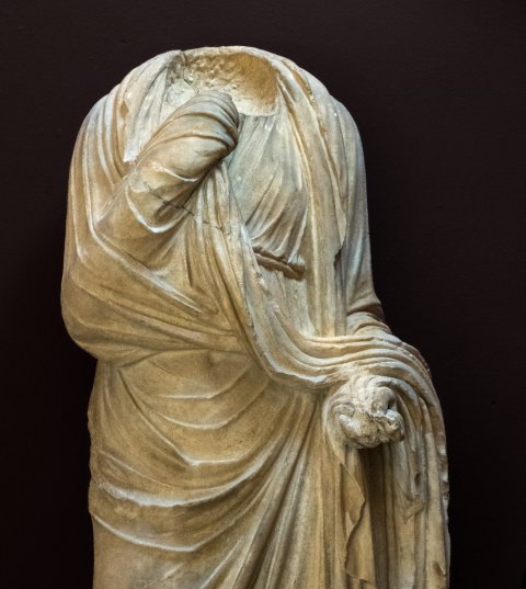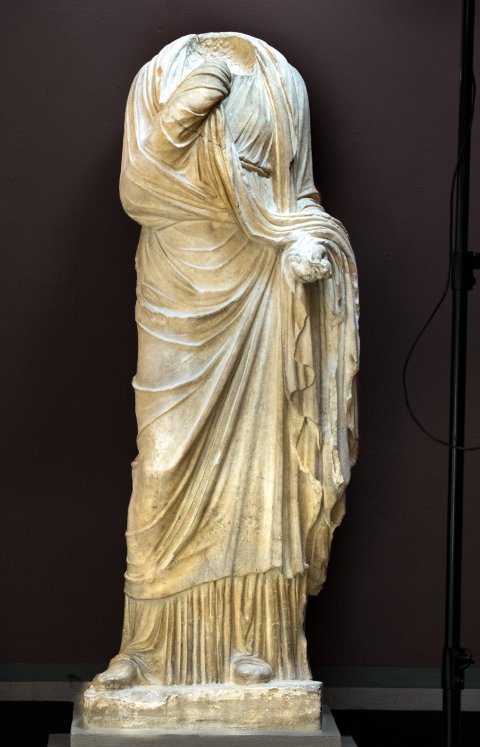 - Stehende Frau in gegürteter Tunica, Mantel und Schuhen. Lebensgroße Grab- oder Ehrenstatue.