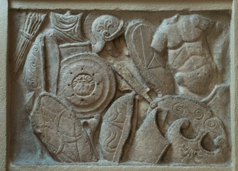 - Waffen: Köcher mit Pfeilen, Oval- und Rundschilde, Peltenschild, Schwert, Helm, vexillum, Panzer