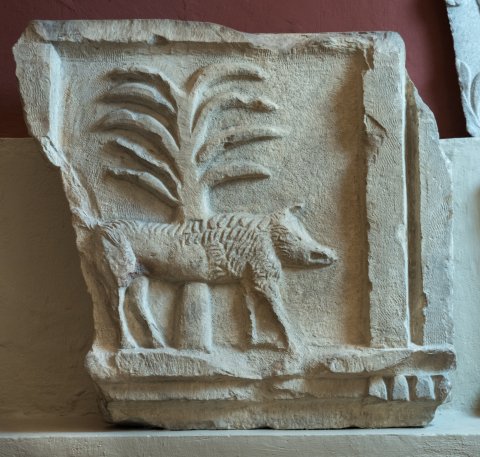 - rechte Eckmetope, darin nach rechts gehender Eber vor einem Baum