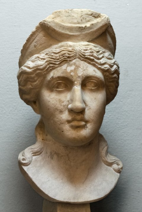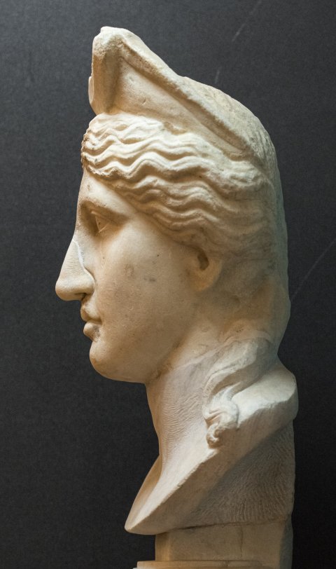 - bestoßen, Bruch unterhalb des Kinns, Nase u. Büste ergänzt