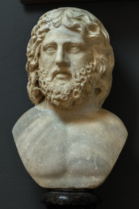 - mythische Figur: Gott mit langem gelockten Haar und Vollbart (Serapis ? Asklepios ?)