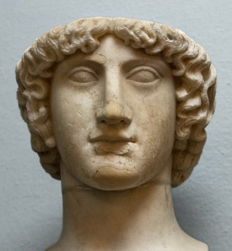 - Kopf eines Jünglings mit tief in die Stirn fallenden Locken, Replik einer klassizistischen Ephebenstatue des 1. Jhs. v. Chr.