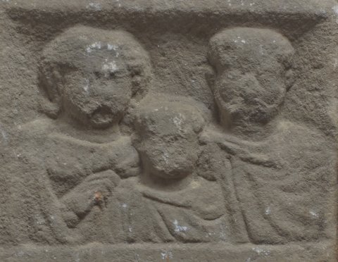 Im Hauptbild Familie: in Rechtecknische Brustbilder eines Ehepaares mit Kind. Links Frau im Mantel. In der Mitte Knabe im Sagum. Rechts bärtiger Mann im Sagum mit Scheibenfibel.