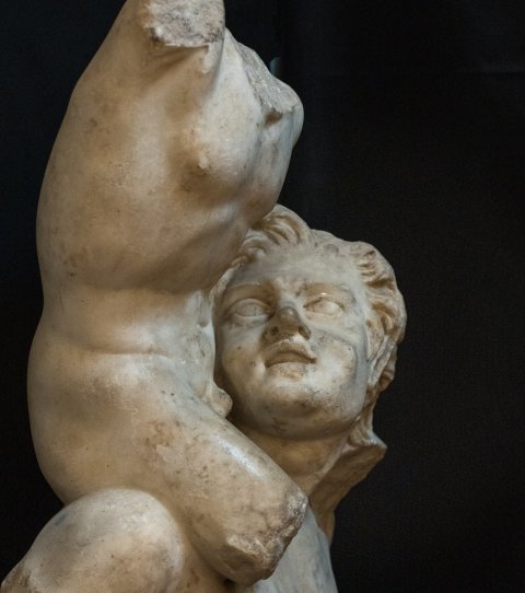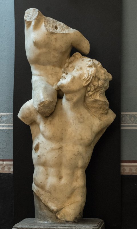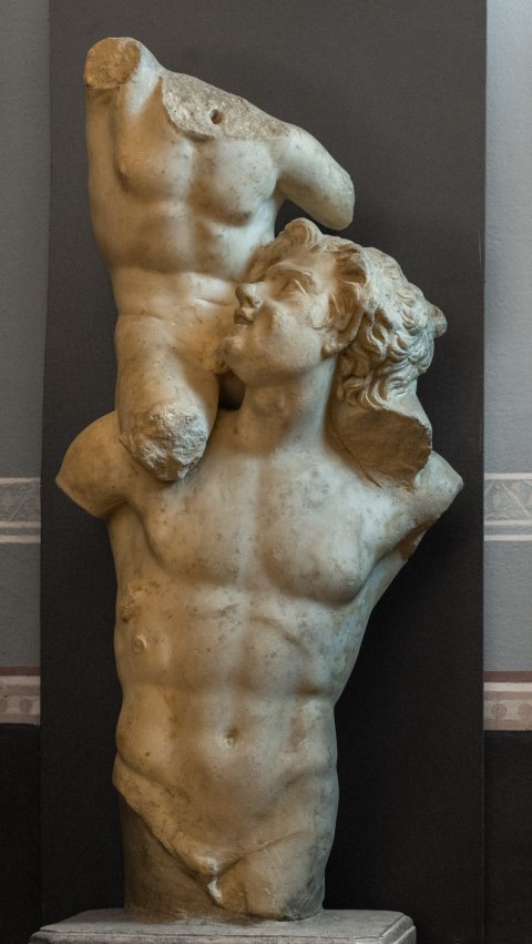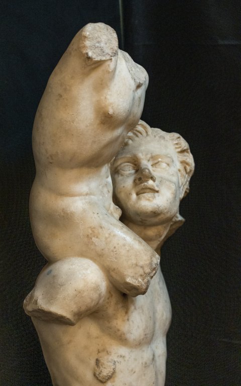 - mythische Figuren: jugendlicher Satyr trägt den Dionysosknaben auf den Schultern