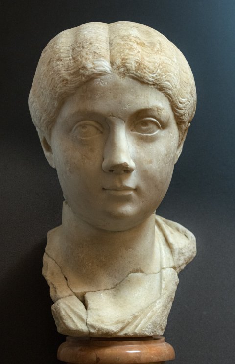 - Bruch unterhalb des Kinns, Nase ergänzt, Hals u. zerbrochene Büste nicht zugehörig