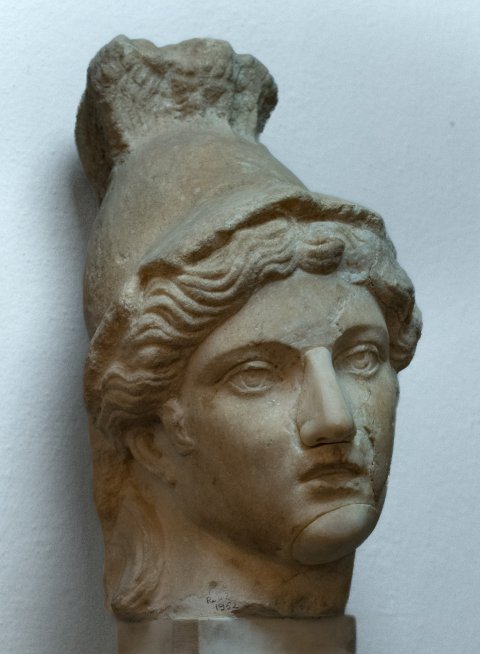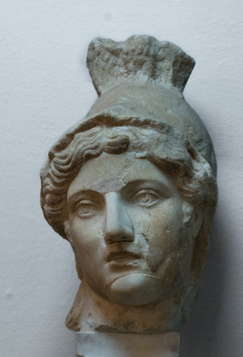 - mythische Figur: weiblicher Kopf mit Helm; Minerva ? Dea Roma ?