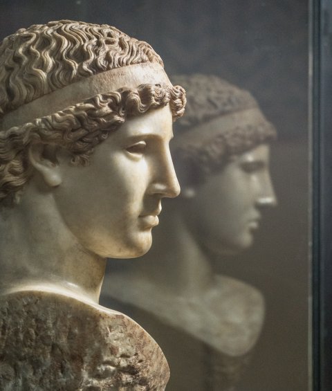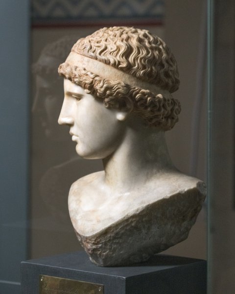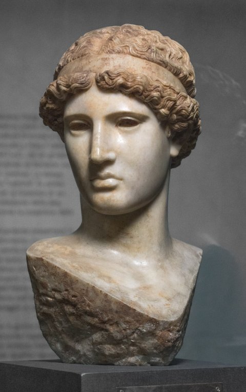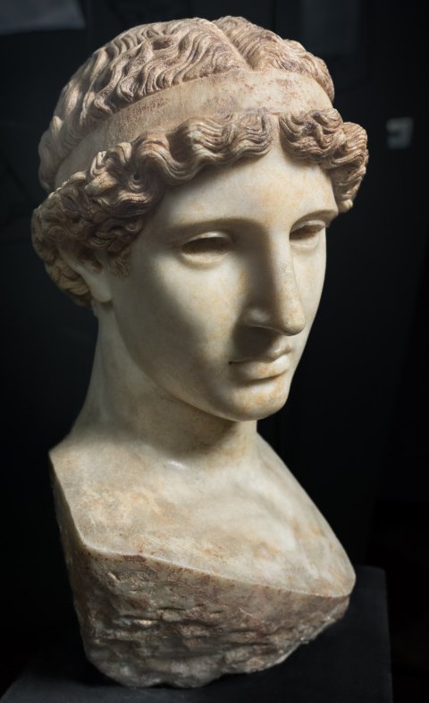 - Mythische Figur: Kopf der römischen Kopie einer überlebensgroßen Bronzestatue der Athena des Phidias auf der Akropolis von Athen (Mitte 5. Jh. v. Chr.).