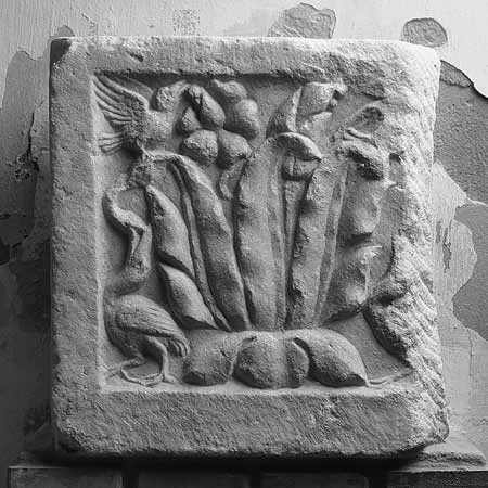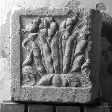 Eckblock, Tiere: auf der Vorderseite an drei Kanten glatt gerahmtes Feld mit Blattkelch und Blüten, oben fliegender Vogel, unten links Vogel mit Schlange im Schnabel, rechts gleich ausgerichteter Vogel, was die friesartige Wiederholung des Motivs nach rechts belegt.