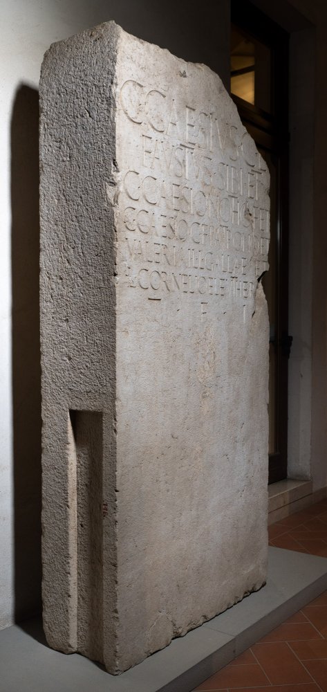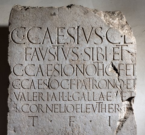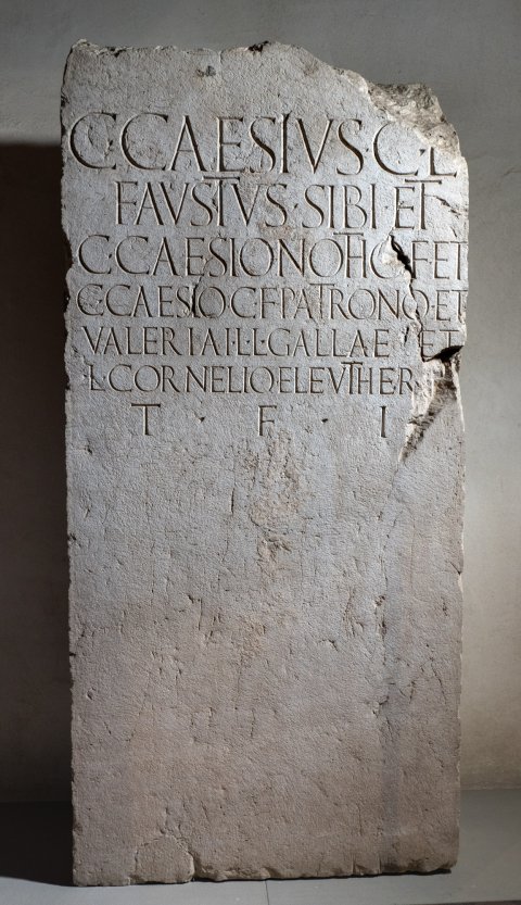 - C(aius) Caesius C(ai) l(ibertus) / Faustus sibi et / C(aio) Caesio Notho f(ilio) et / C(aio) Caesio C(ai) f(ilio) patrono et / Valeriai L(uci) l(ibertae) Gallae et / L(ucio) Cornelio Eleuthero / t(estamento) f(ieri) i(ussit)