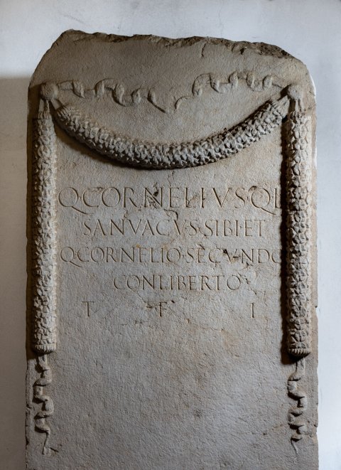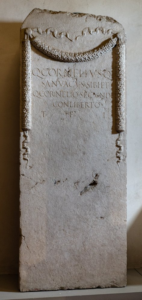 - Q(uintus) Cornelius Q(uinti) l(ibertus) / Sanuacus sibi et / Q(uinto) Cornelio Secundo / conliberto / t(estamento) f(ieri) i(ussit)
