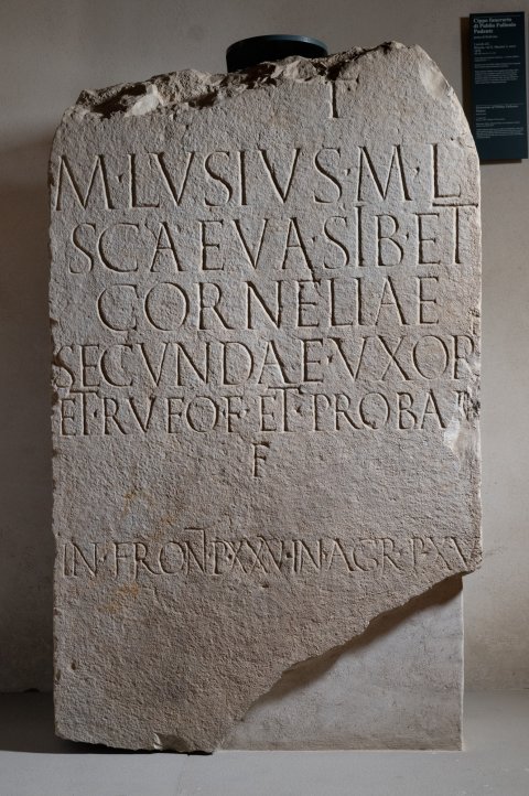 - [V(ivus)] f(ecit) / M(arcus) Lusius M(arci) l(ibertus) / Scaeva sib(i) et / Corneliae / Secundae uxori / et Rufo f(ilio) et Proba[e] / f(iliae) / in front(e) p(edes) XXV in agr(o) p(edes) XV