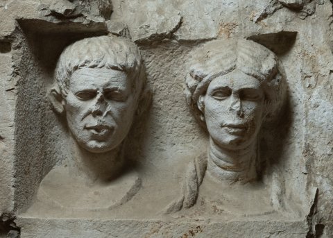 - Über dem Schriftfeld Rechtecknische mit zwei Porträtbüsten (Ehepaar). Links bartloser Mann, rechts Frau mit Schulterlocken