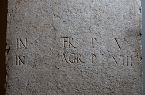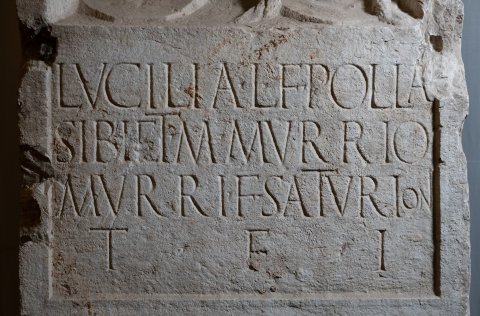 - Lucilia L(uci) f(ilia) Polla / sibi et M(arco) Murrio / Murri f(ilio) Saturioni / t(estamento) f(ieri) i(ussit) // in fr(onte) p(edes) V / in agr(o) p(edes) VIII