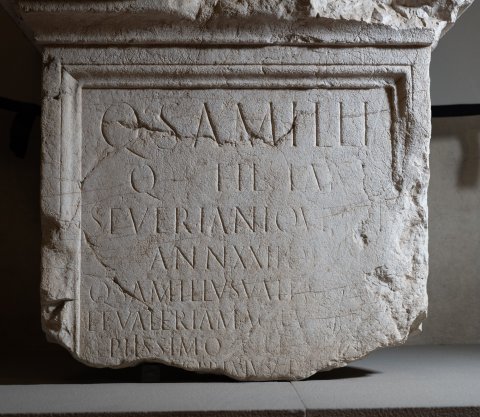- D(is) [M(anibus)] // Q(uinti) Samilli / Q(uinti) fil(ii) Fab(ia) / Severiani qui vixit / ann(os) XXII d(ies) IIII / Q(uintus) Samillus Valerian[us] / et Valeria Magia filio / piissimo et [---] / [---]us Primus [