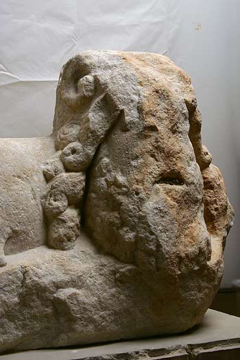 - Mythische Figur (Jupiter Ammon): liegende Löwen, zwischen ihnen bärtiger Kopf mit Polos (Modius) und Widderhörnern.