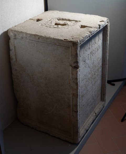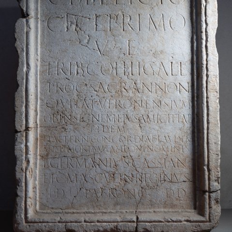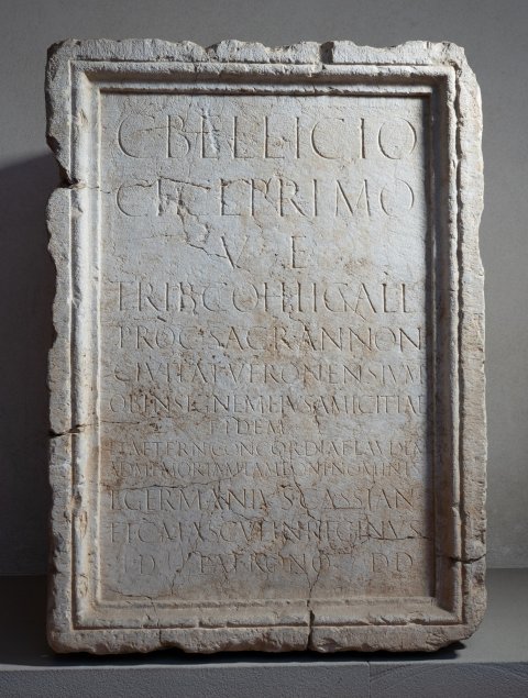 - C(aio) Bellicio / C(ai) f(ilio) Cl(audia) Primo / v(iro) e(gregio) / trib(uno) coh(ortis) II Gall(orum) / proc(uratori) sacr(ae) annon(ae) / civitat(e) Veronensium / ob insignem eius amicitiae / fidem / et aetern(am) concordiae laudem / ad memoriam tam boni nominis / L(ucius) Germanius Cassian(us) / et C(aius) Masculin(ius) Reginus / patrono / l(ocus) d(atus) d(ecreto) d(ecurionum)